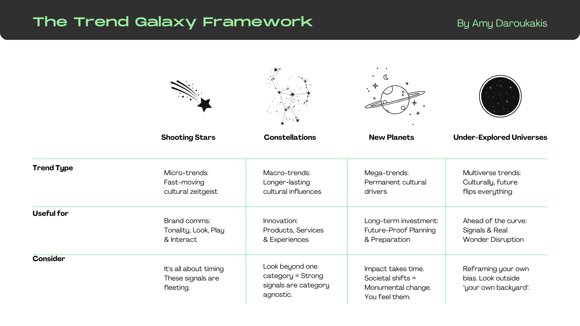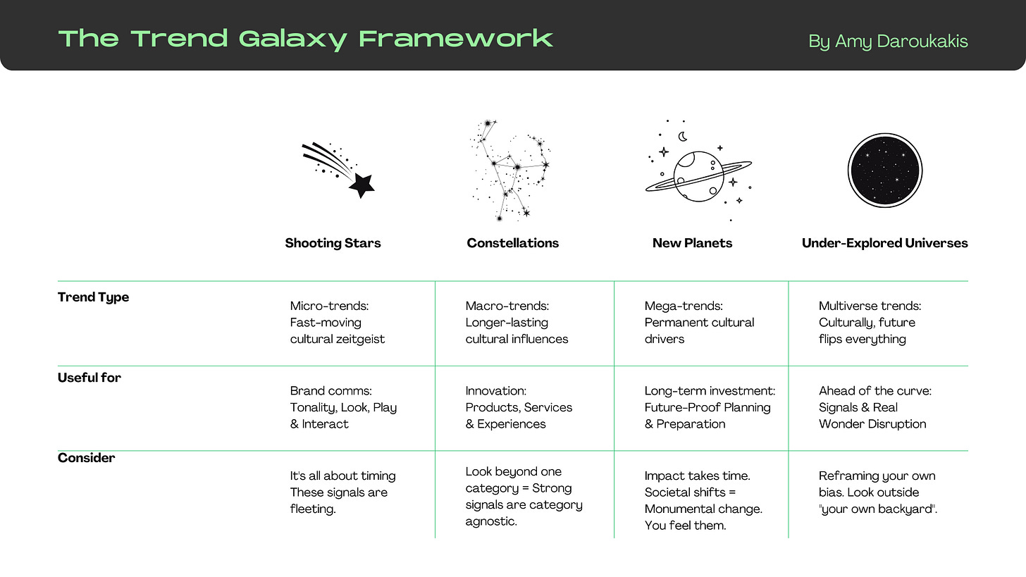 The Trend Galaxy Framework emphasizes narrative over nodes. Rather than isolating signals, it put together cultural stories, creating edges where context and history meet innovation. Making it an antidote to the dominant trend reports that often repeat the same insights year after year.